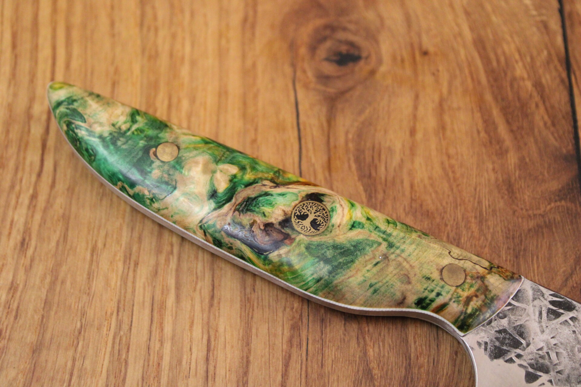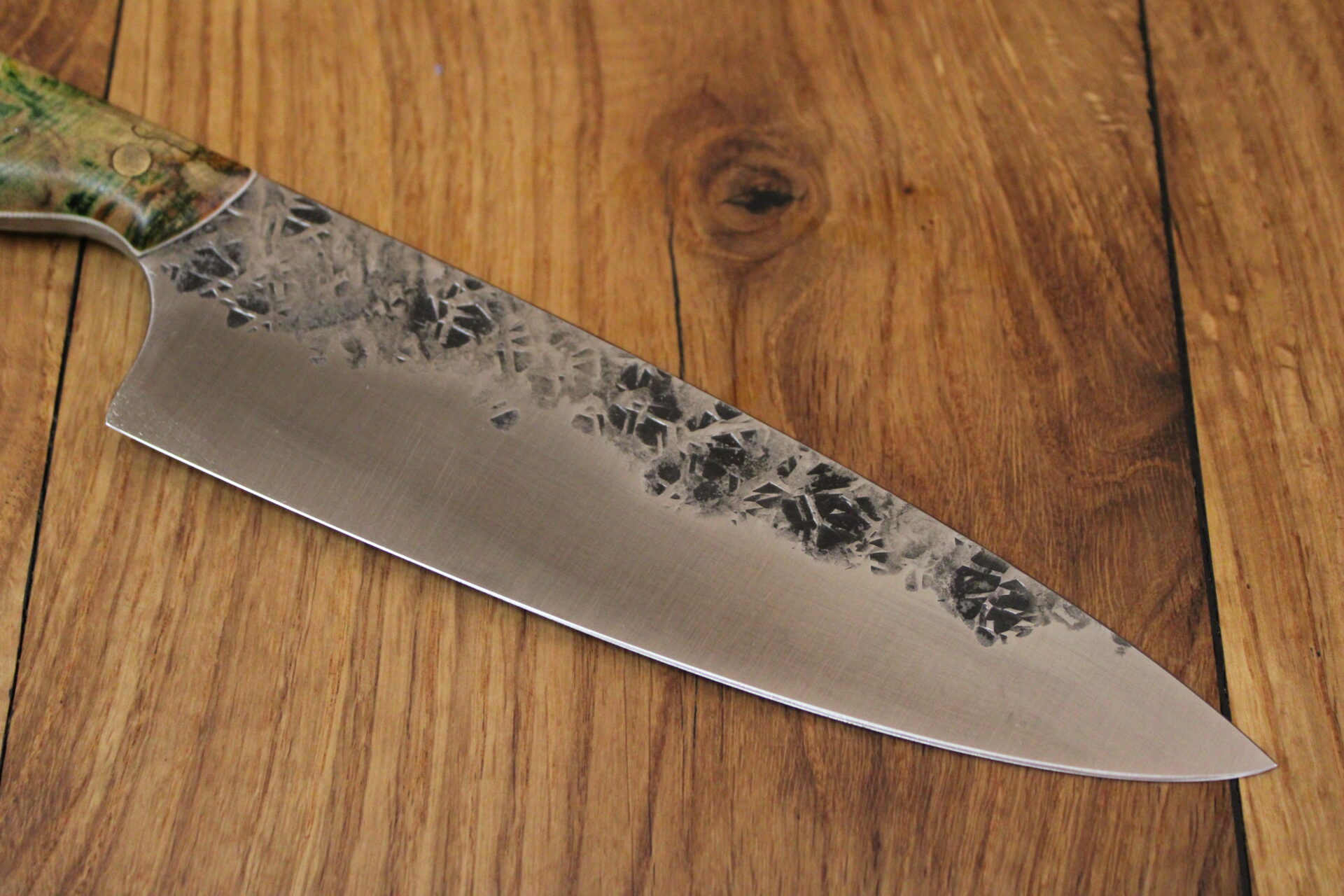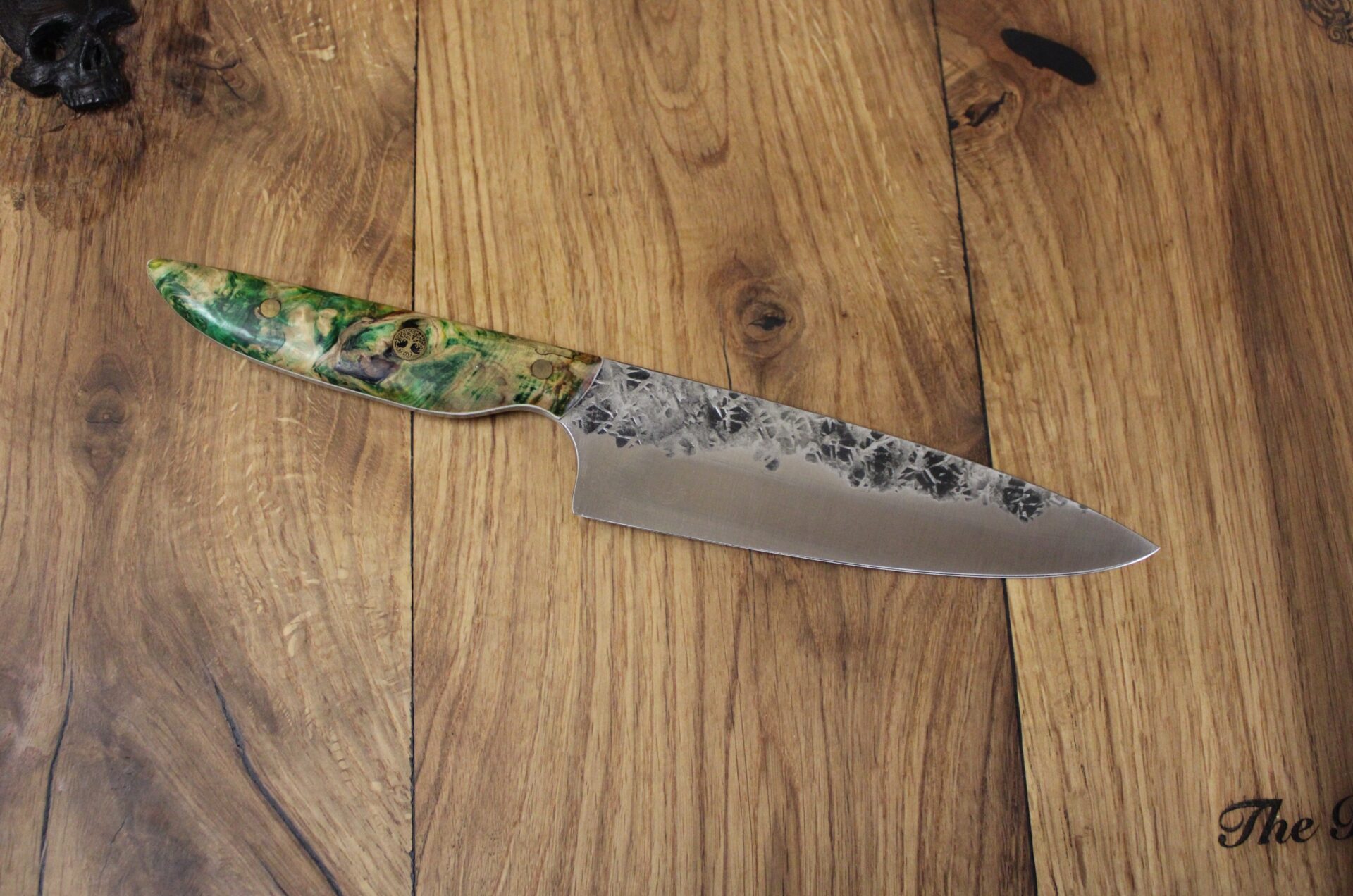 Beschreibung Chefmesser/ Küchenmesser Griffaufbau: grün stab. Kanstanie Finish: rustikal gehämmert Material Stahl: SB1+ rostfrei Härte (HRC): 61 ABmessungen Gesamt: 31,7 cm Griff: 13,7 cm Klinge: 18 cm Klingenbreite: 4,7 cm Stärke: 3 mm InteressE? Melde dich bei uns!