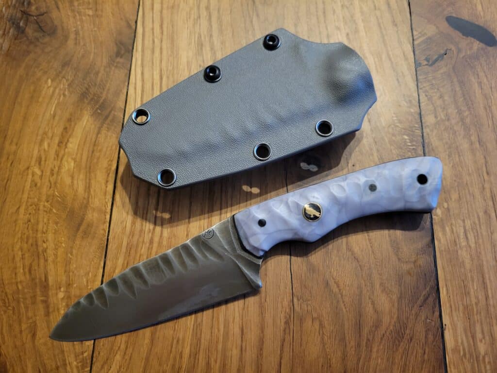 Beschreibung Hawk Jagdmesser Griffaufbau: „Juma Ice“ Finish: satiniert inkl. Kydex Material Stahl: TNT 666 Härte (HRC): 60 Abmessungen Gesamt: 23 cm Griff: 11,2 cm Klinge: 11,8 cm Klingenbreite: 4,5 cm Stärke: 3 mm InteressE? Melde dich bei uns!