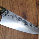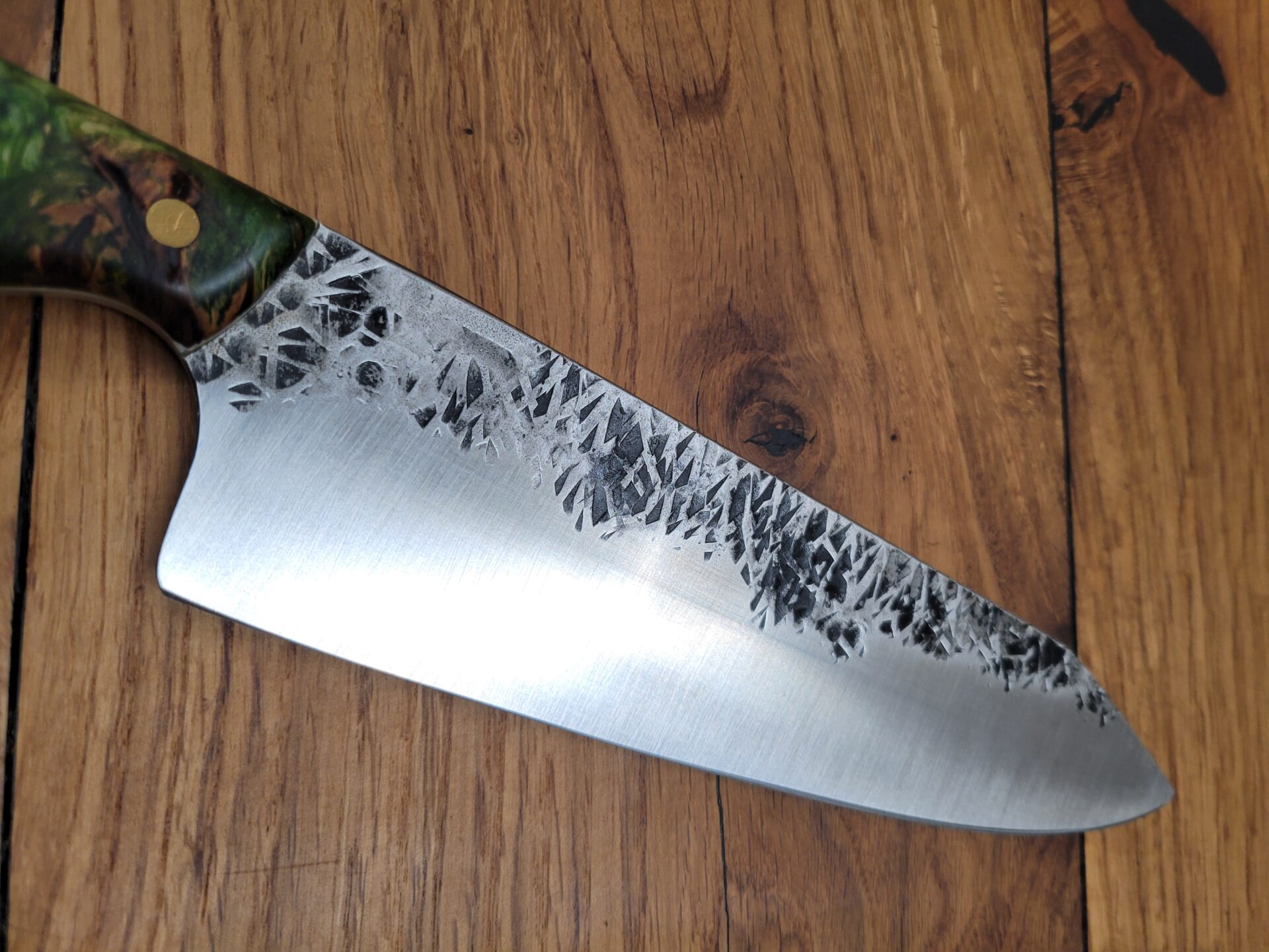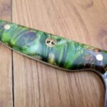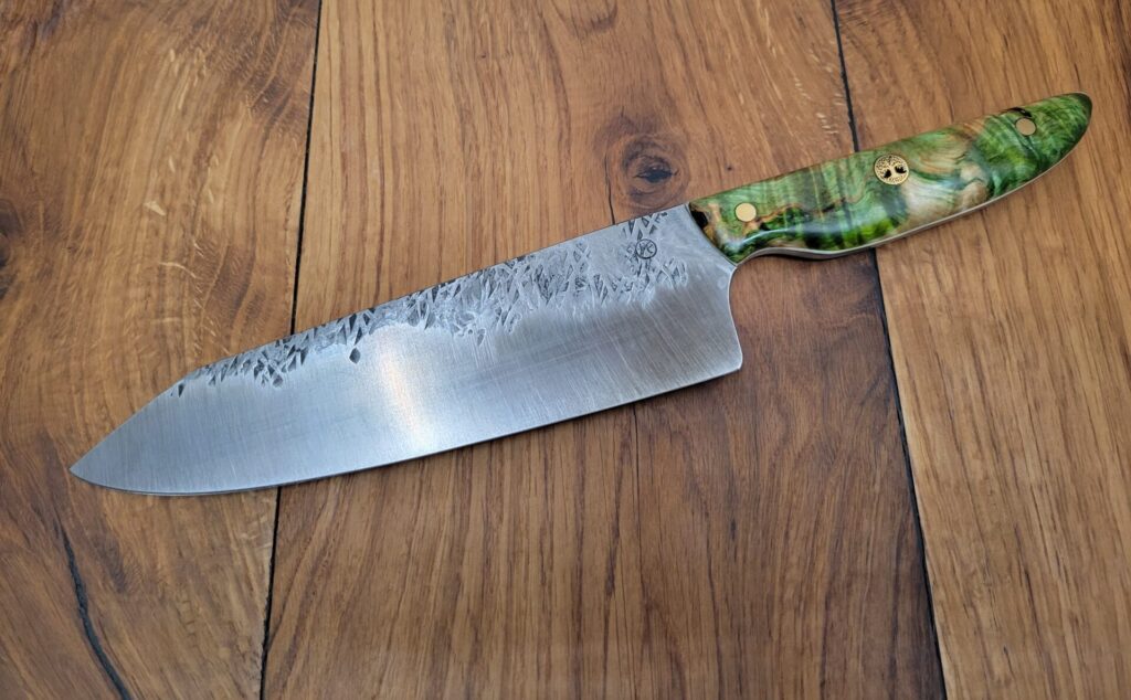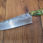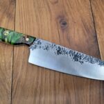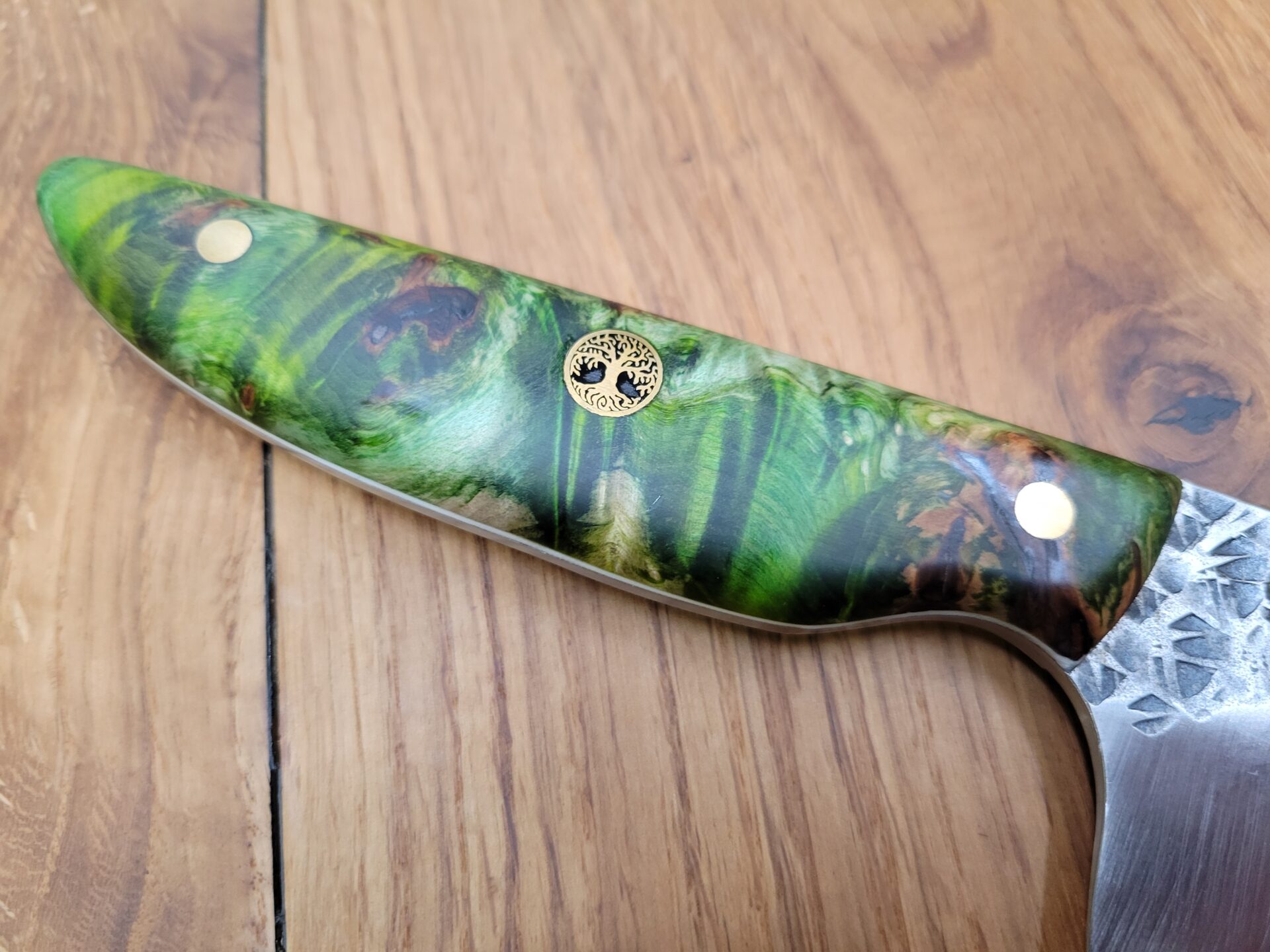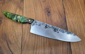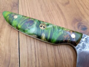 Beschreibung Küchenmesser – rostfrei Griffaufbau: grün stabilisierte Kastanie Finish: rustikal gehämmert Material Stahl: SB1+ rostfrei Härte (HRC): 61 – 62 Abmessungen Gesamt: 32 cm Griff: 13,2 cm Klinge: 18,8 cm Klingenbreite: 5,2 cm Stärke: 2,9 mm InteressE? Melde dich bei uns!