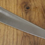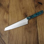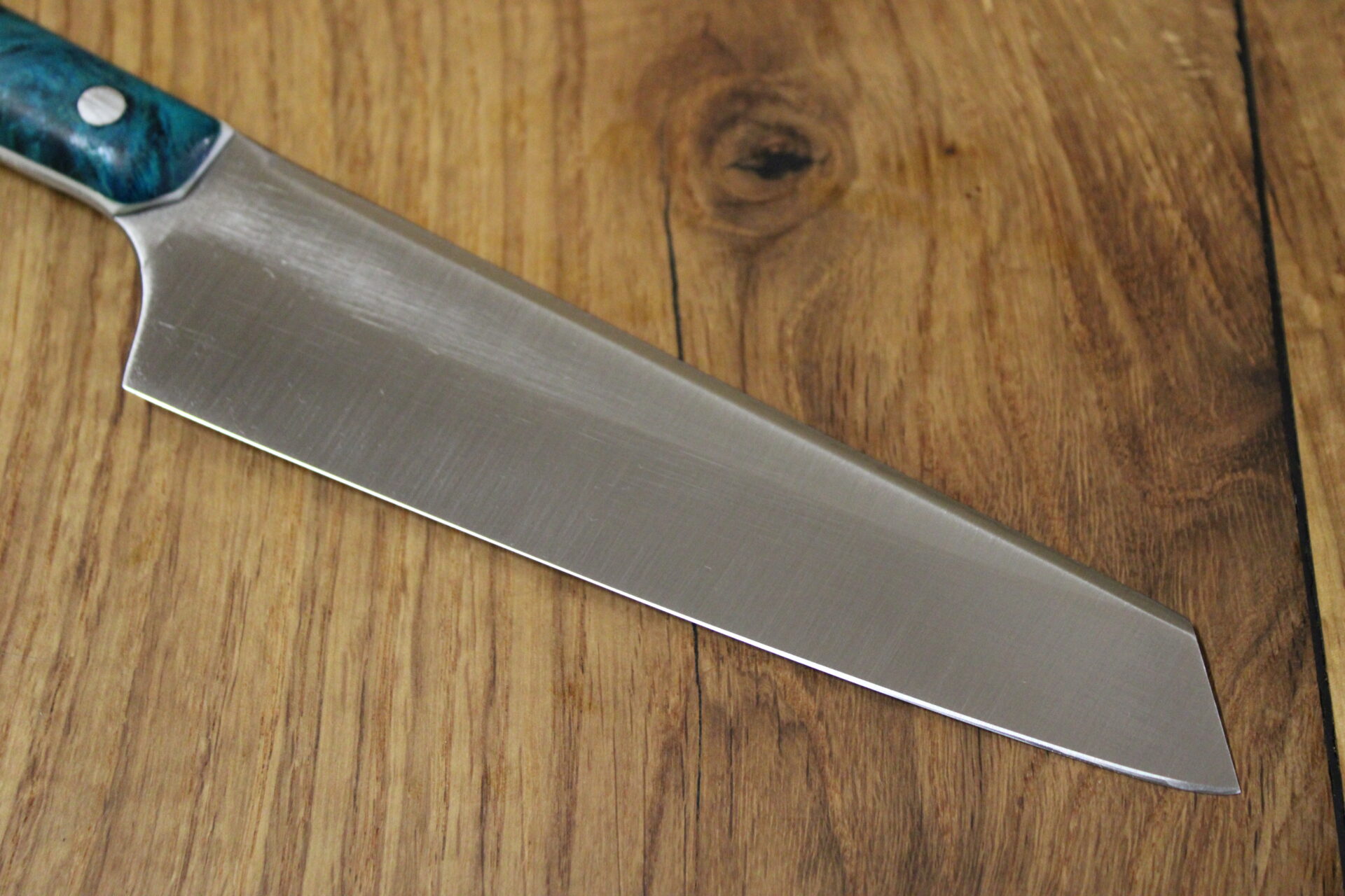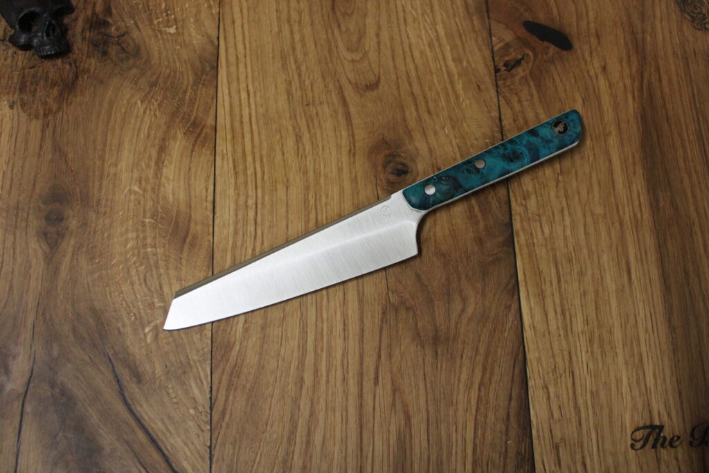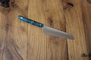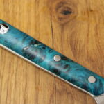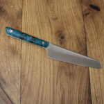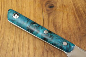 Beschreibung Küchenmesser Griffaufbau: blau stab. Pappelmaserknolle Finish: clean Material Stahl: RWL34 Härte (HRC): 61 ABmessungen Gesamt: 27,8 cm Griff: 12,2 cm Klinge: 15,6 cm Klingenbreite: 3,8 cm Stärke: 1,8 mm InteressE? Melde dich bei uns!
