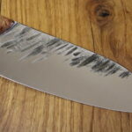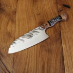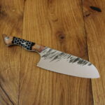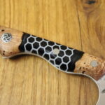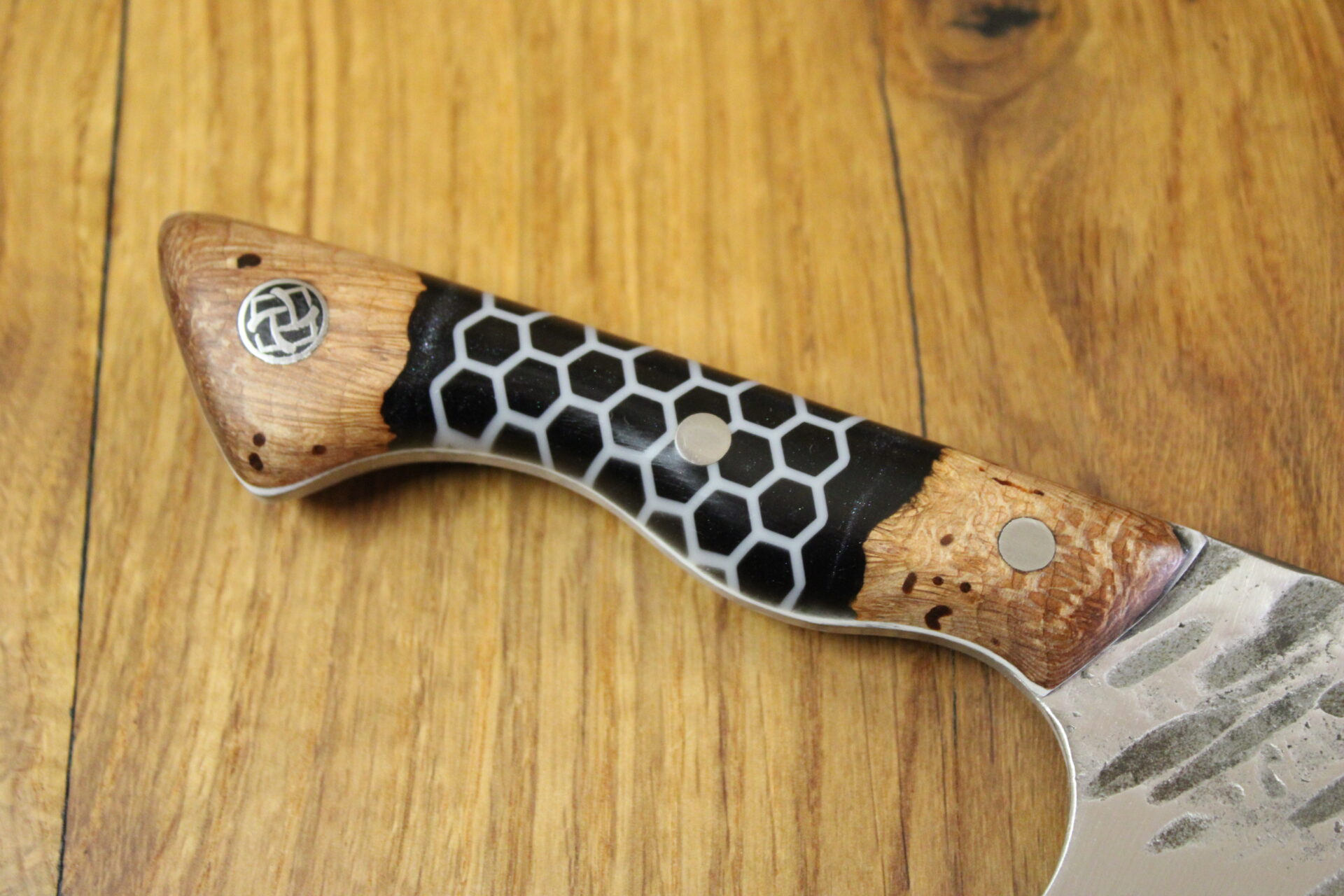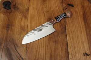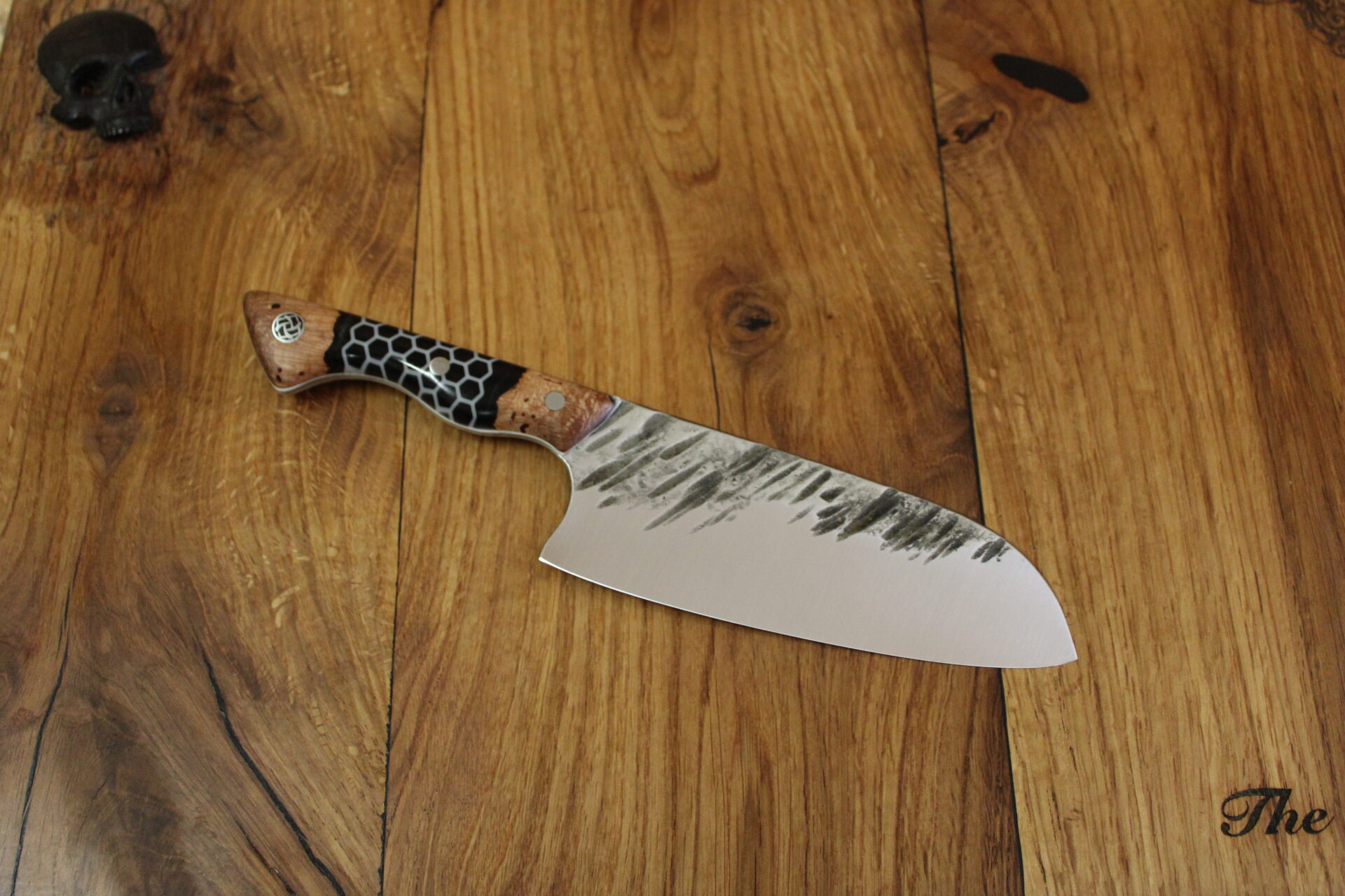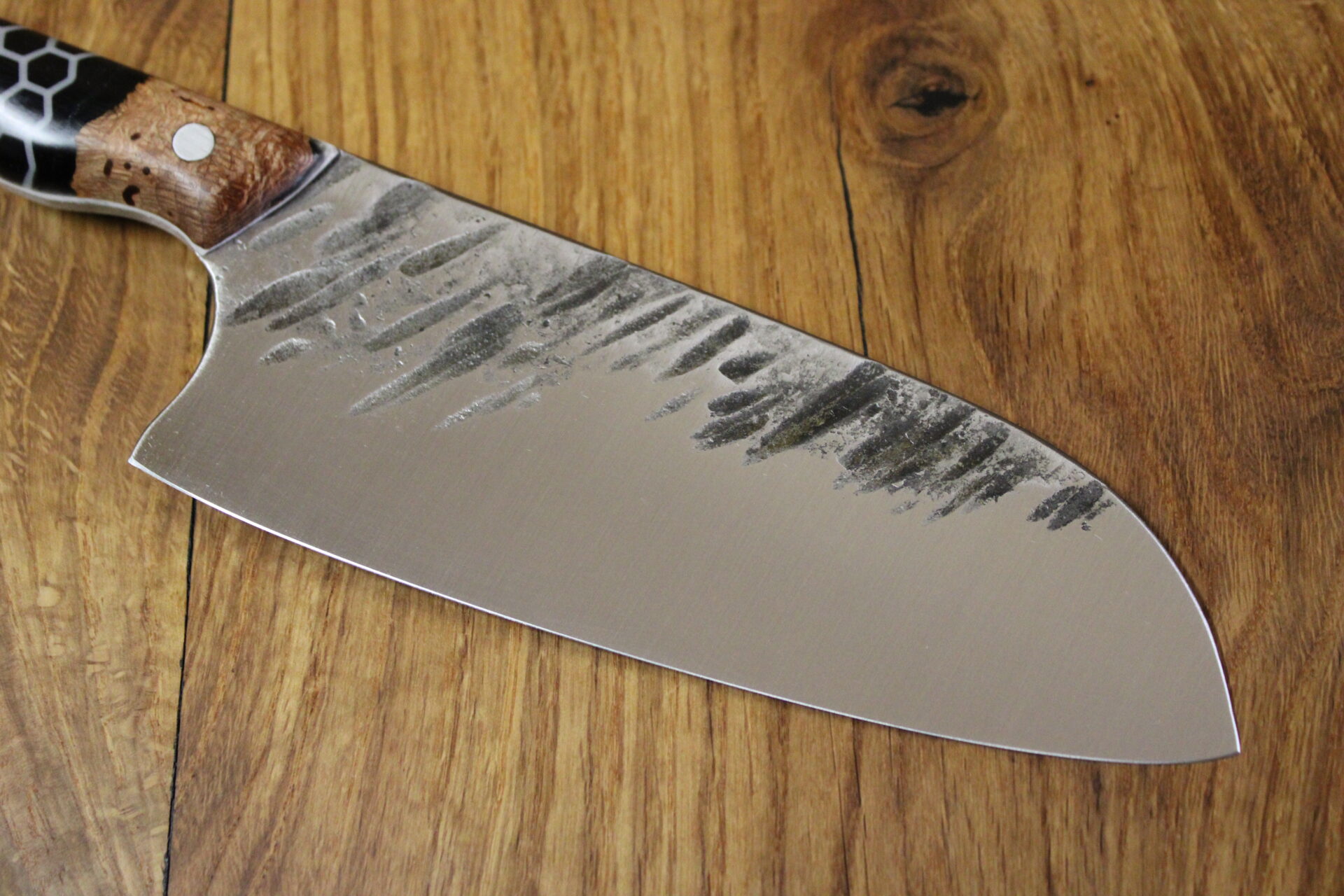 Beschreibung Küchenmesser Griffaufbau: stab. Platane und Epoxy schwarz mit Waben Finish: rustikal gehämmert Material Stahl: 14C28N rostfrei Härte (HRC): 60 ABmessungen Gesamt: 27,9 cm Griff: 12,9 cm Klinge: 15 cm Klingenbreite: 5,7 cm Stärke: 3 mm InteressE? Melde dich bei uns!