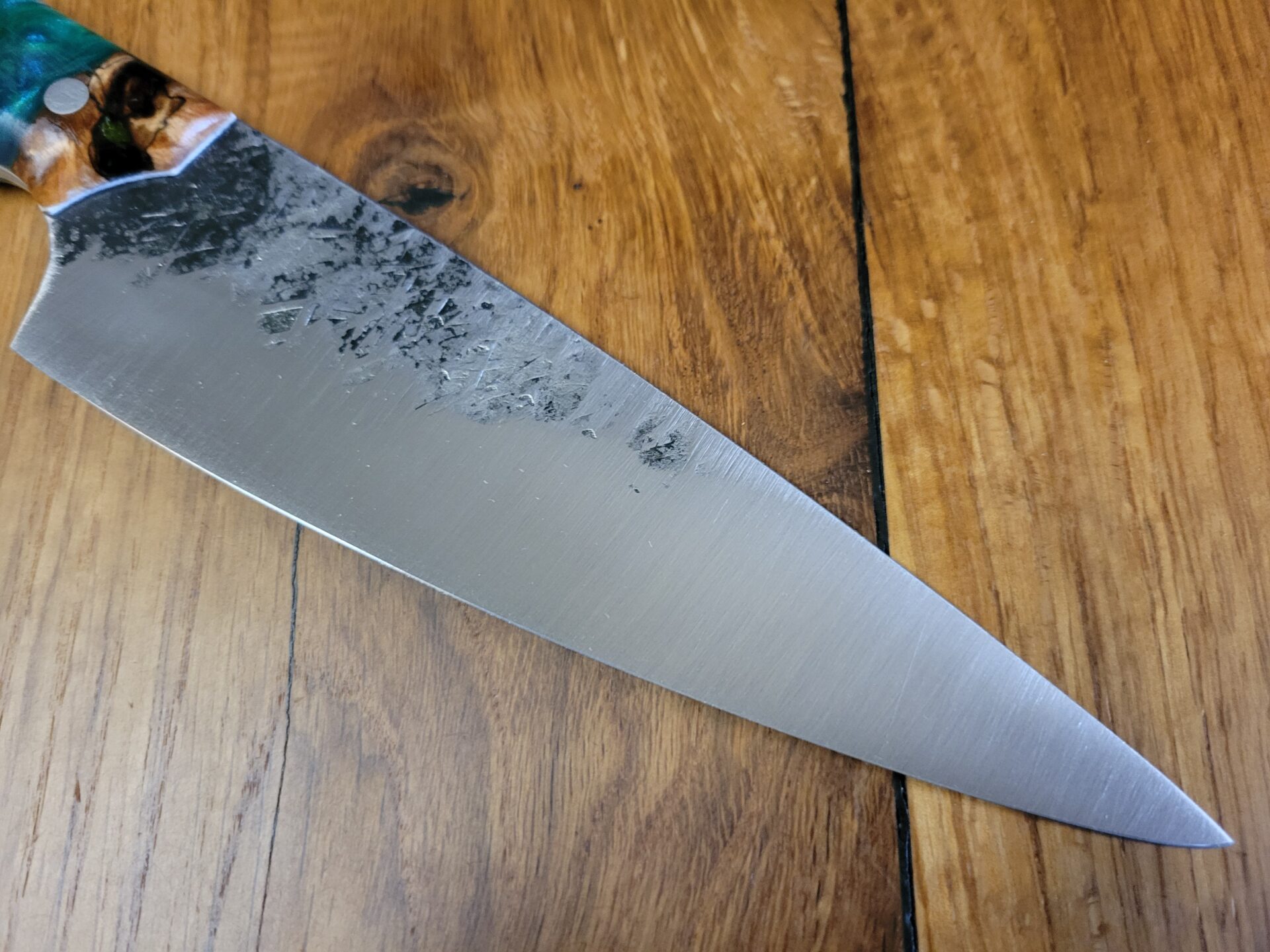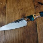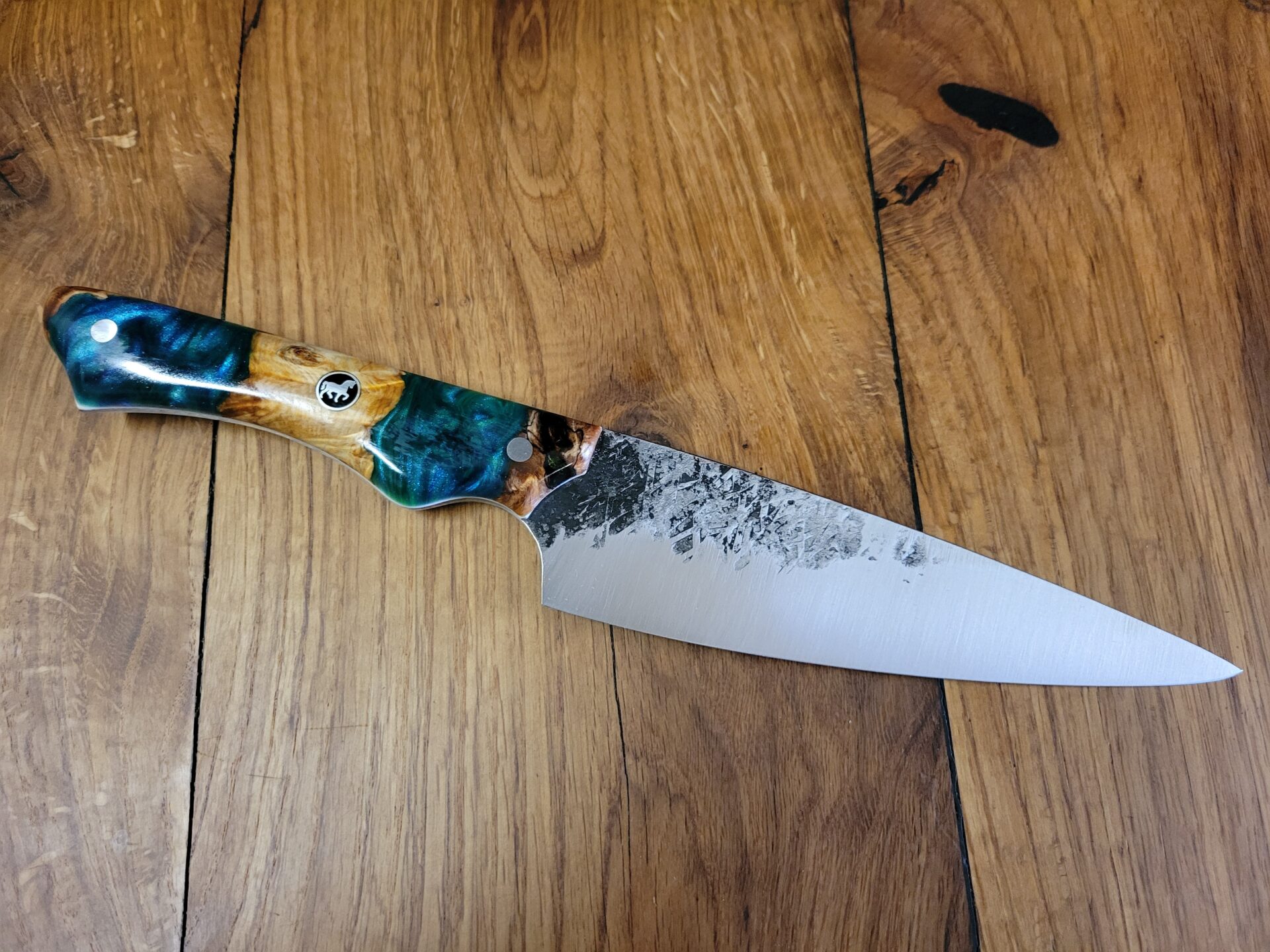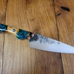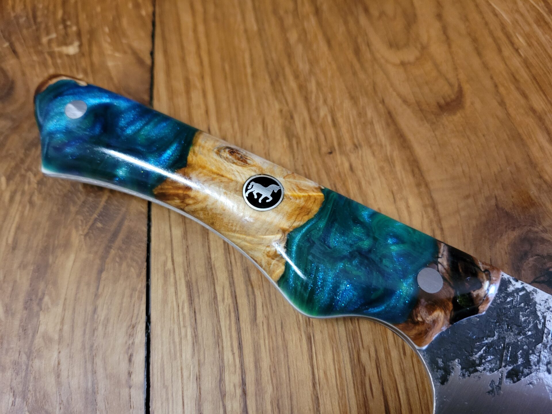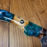- Griffaufbau: stabilisierte gestockte Kastanie mit Epoxy grün- blau