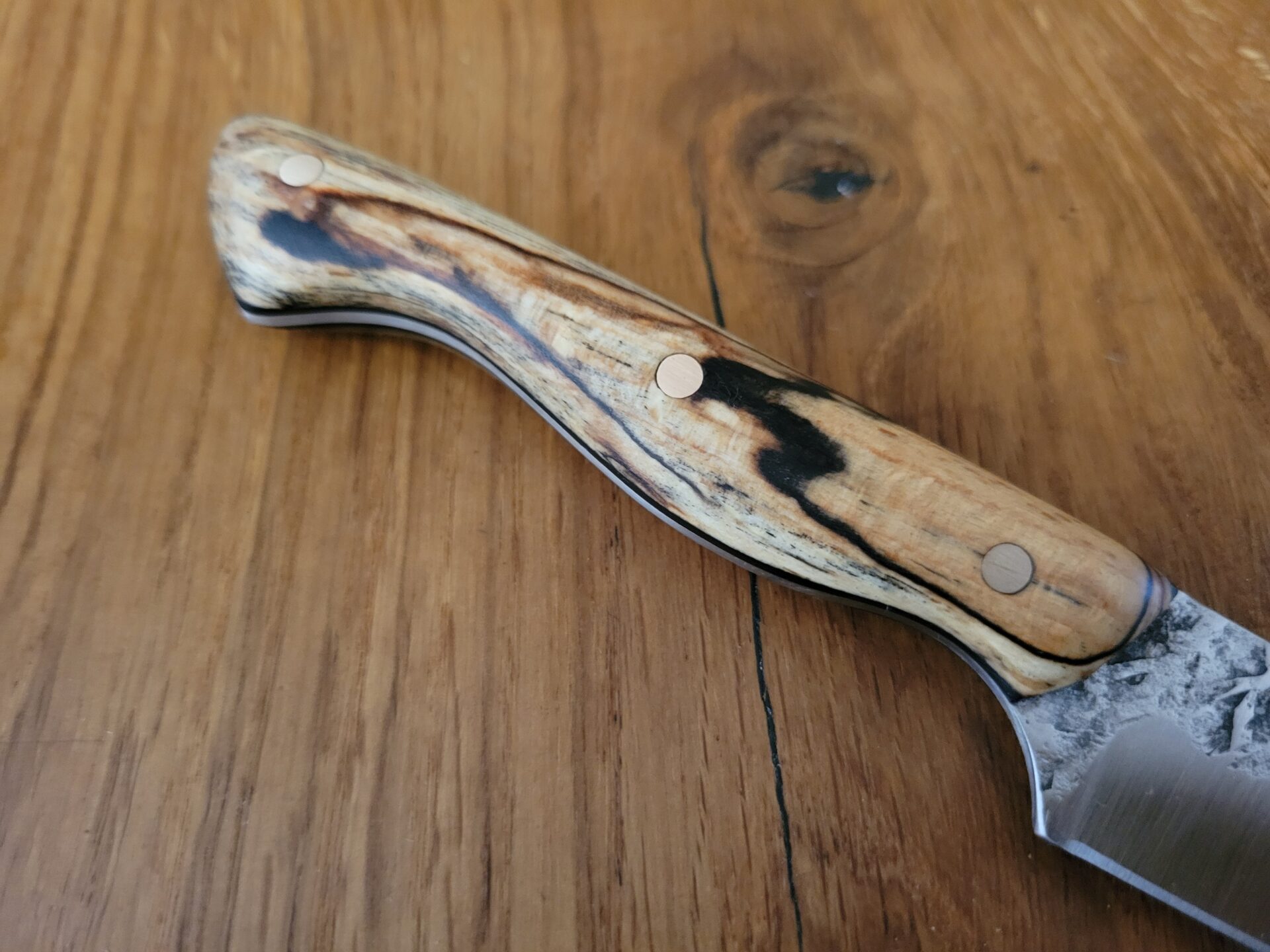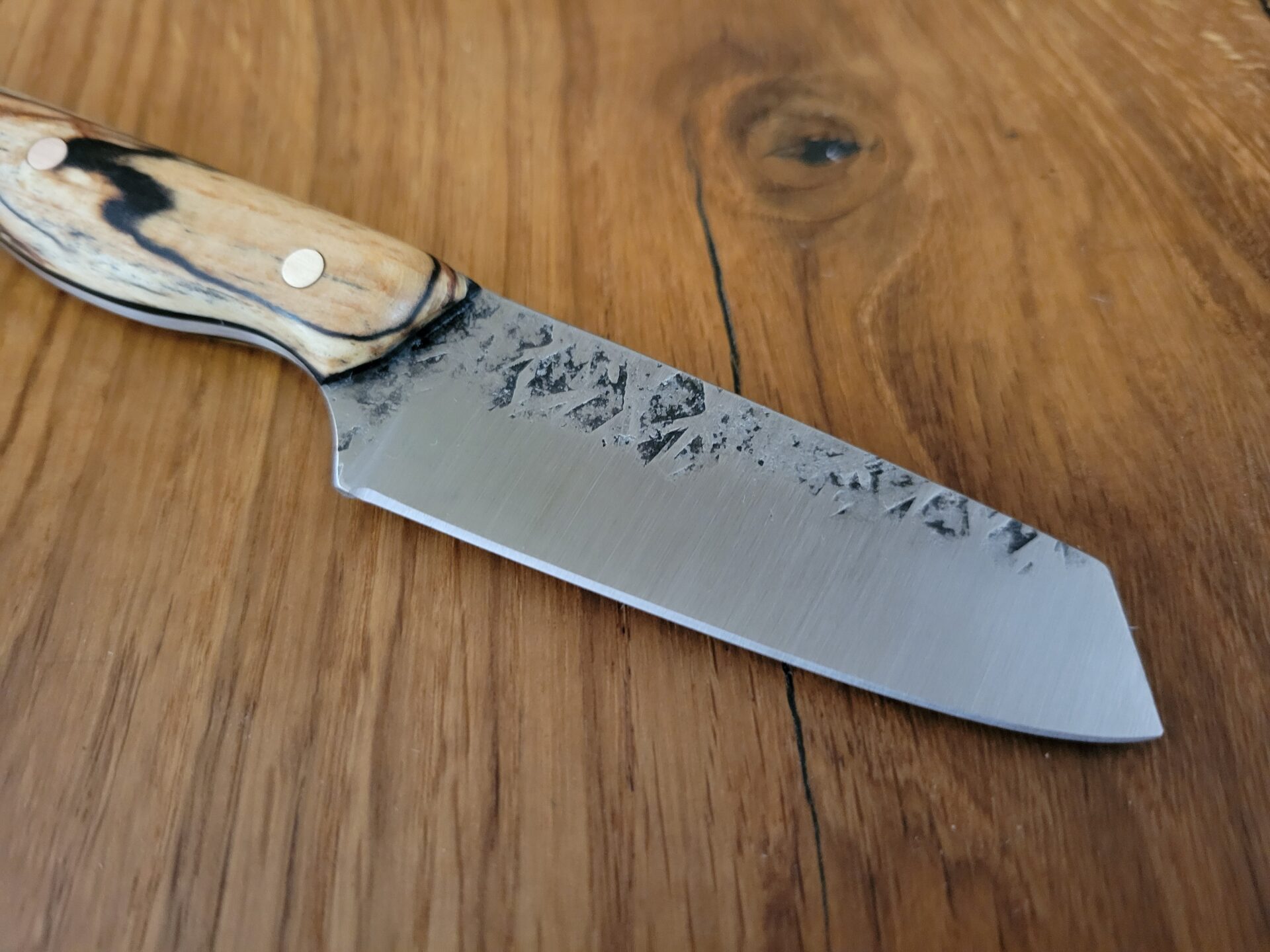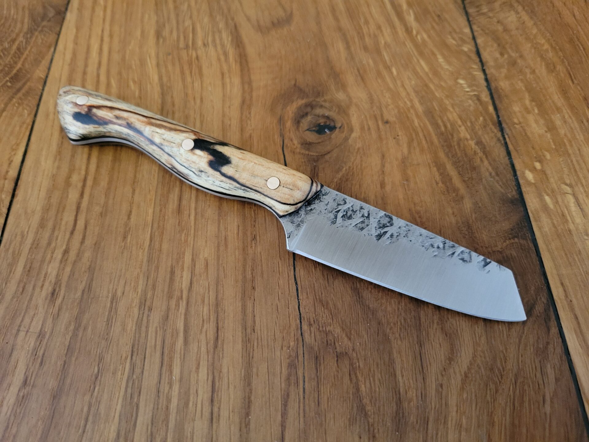 Beschreibung Küchenmesser/ Schälmesser Griffaufbau: stabilisierte gestockte Buche Finish: rustikal gehämmert Material Stahl: 14C28N rostfrei Härte (HRC): 59 Abmessungen Gesamt: 17,4 cm Griff: 10,2 cm Klinge: 7,2 cm Klingenbreite: 2,4 cm Stärke: 2 mm InteressE? Melde dich bei uns!